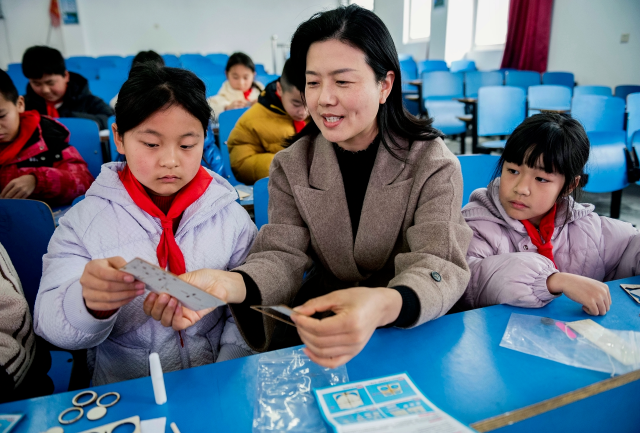 非遗剪纸进校园 11月17日,河北省唐山市非遗剪纸项目传承人在指导学生剪纸。20多年来,唐山市路北区韩城镇中门庄小学坚持开设非遗剪纸文化课,并聘请非遗传承人为学生授课,培养学生的动手能力,让学生们感受传统文化的魅力。