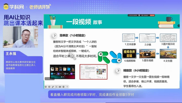 近日,学科网全国大型公益栏目《老师请开讲》学AI用AI系列第15期开讲。山东省威海市文登区教育教学研究中心主任、省市级教育信息化主题主讲人王永强,以“用AI让知识跳出课本活起来”为主题,为中小学教师带来一场让知识可视化、教学趣味化的实操教学。直播中,王永强构建了“教案—音频—视频—PPT”的全链路资源生成闭环,覆盖教学授课全场景。