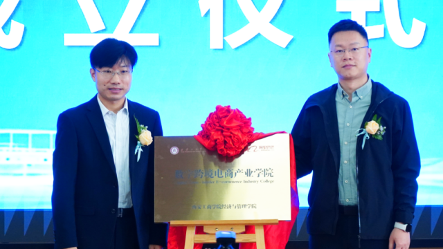 副校长程波与阿里巴巴国际站渠道运营专家陈新,代表校企双方为数字跨境电商产业学院揭牌