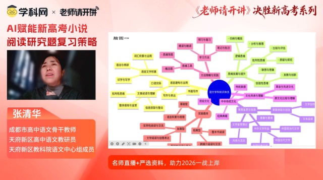 为深入贯彻新高考素养立意命题要求,破解小说阅读创新题备考痛点,11月学科网“老师请开讲”决胜新高考系列讲座开讲。新高考背景下,传统知识本位的复习模式难以应对开放性、思辨性极强的创新题型。针对这一痛点,四川成都市高中语文骨干教师、天府新区高中语文教研员、天府新区教科院语文中心组成员张清华以“AI赋能新高考小说阅读研究题复习策略”为主题,紧扣语文核心素养维度,提出“AI赋能+教考衔接”的备考新路径,为新高考小说阅读创新题备考提供了高效、可复制的解决方案。