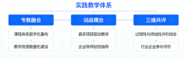 学院以多元智能、第四代评价等理论为遵循,构建“实训实习—技能竞赛—创业孵化”三维一体、行企校多元参与的教学评价体系,实现育人成效动态评估。
