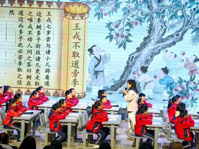 天门市高新园小学语文会场内,天门市第一小学教师刘纯琴执教《王戎不取道旁李》,巧妙运用图文对照、古今联读等教学策略,借助多媒体直观创设文言情境,将抽象的文言文字转化为具象的场景画面,有效降低了学生理解文言文的门槛,让古典智慧在生动解读中可感可知、入脑入心。