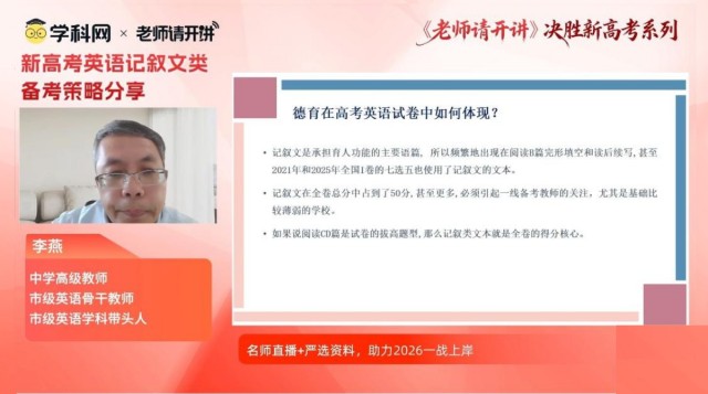 近日,学科网老师请开讲“2026决胜新高考”系列讲座中,河北省市级英语学科带头人、英语骨干教师李燕以“新高考英语记叙文类备考策略分享”为主题,从真题解码、资源整合、实操训练三个方面,为师生带来科学复习方案。