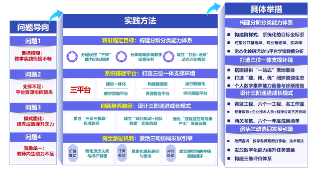 在具体实践中,学校围绕数字入目标、数字入平台、数字入路径、数字入激励四大维度推出针对性举措,让培育体系落地见效。第一,精准锚定目标,构建分阶分类能力体系,破解目标模糊、教学实践衔接不畅问题。学校结合中职教学实训场景与教师职业成长规律,搭建基础能力、专业技能、创新能力三维能力模块,按新任教师—骨干教师—学科带头人三阶分段考核,形成阶梯式、差异化目标体系。同时对接公共基础课、专业理论课、实训课三类课型,明确应用任务:公共基础课侧重数字技术趣味化与个性化设计,专业理论课强化知识可视化与岗位需求对接,实训课突出虚拟仿真技术应用与过程性数字化评价。此外,建立“目标—场景”动态匹配机制,通过常态化教研与教学数据分析优化目标与场景适配度,形成闭环迭代,切实保障学用结合。