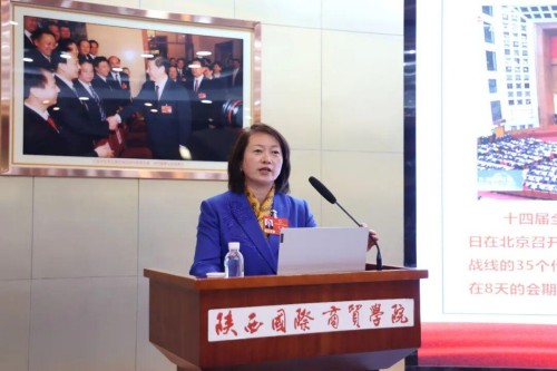 为深入学习宣传贯彻全国两会精神,切实将两会精神融入办学治校、党建思政、人才培养、学科建设、社会服务等各方面全过程,引导师生将个人理想融入国家发展和民族复兴的伟大事业,凝聚起团结奋斗、干事创业的强大力量,3月24日下午陕西国际商贸学院邀请全国人大代表、步长制药副董事长赵菁,在学校学术报告厅作全国两会精神专题宣讲报告。全体校领导、副科级以上干部、学生代表现场聆听,各部门、各单位师生通过线上平台同步收看直播。