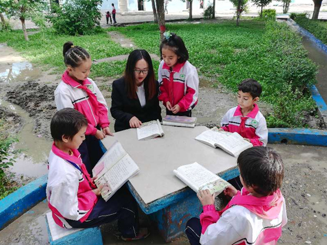 在拜城县向阳小学,二年级(1)班的努尔艾斯玛?艾米热力拉正带着同伴们诵读《笠翁对韵》,他说自己和同学喜欢唱歌跳舞,所以他们把国学诵读以舞蹈游戏的形式表现出来。“我们很喜欢读国学。”孩子们说。带领孩子们进行经典诵读的张晓凤老师是孩子们的数学老师,张晓凤介绍,每天都会用固定的时间带领孩子们进行经典诵读,孩子们对国学的兴趣也越来越浓。