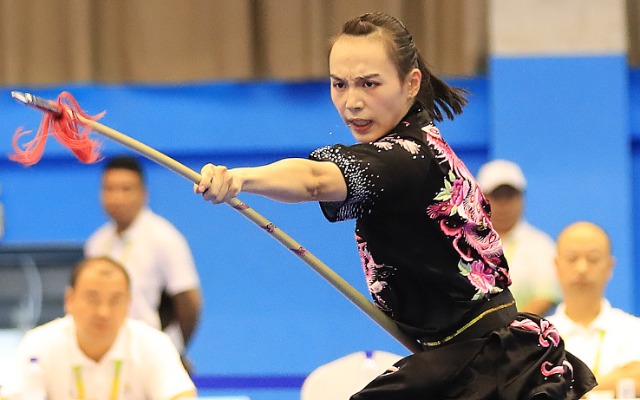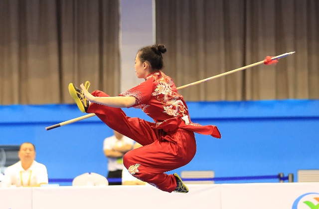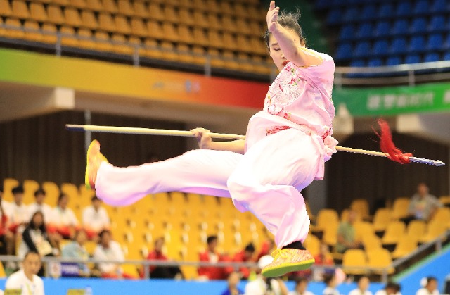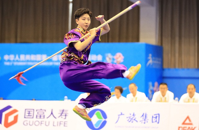 11月6日,首届学青会(校园组)武术套路大学女子组自选枪术项目决赛中。张学军摄