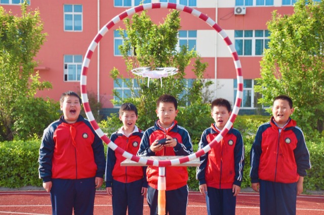 2025年10月9日,在山东省淄博市高青县唐坊学区和店小学,科技社团的学生在展示多轴遥控无人机飞行技能。“双减”政策实施以来,为进一步促进学生的个性化成长,该校开发了部分集趣味性、竞技性、科普性于一体的创客特色课程,使学生学有所乐、学有所长、健康成长。(中国教育报-中国教育新闻网 通讯员 孙传波 摄)