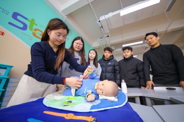 学生利用仿真新生儿练习日常照护技能。通讯员 张鹰 摄