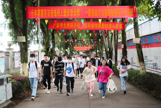 6月14日,2022年湖南省普通高中学业水平合格性考试新田县一中考点,考生在考完最后一场后有序离开考场。当天,2022年湖南省普通高中学业水平合格性考试顺利结束。据了解,本次新田考区设新田一中和新田二中两个考点,新田县高二学考3060人,设109个考室;高一学考2896人,设114个考室;共5956名考生参加本次学考。刘贵雄 摄