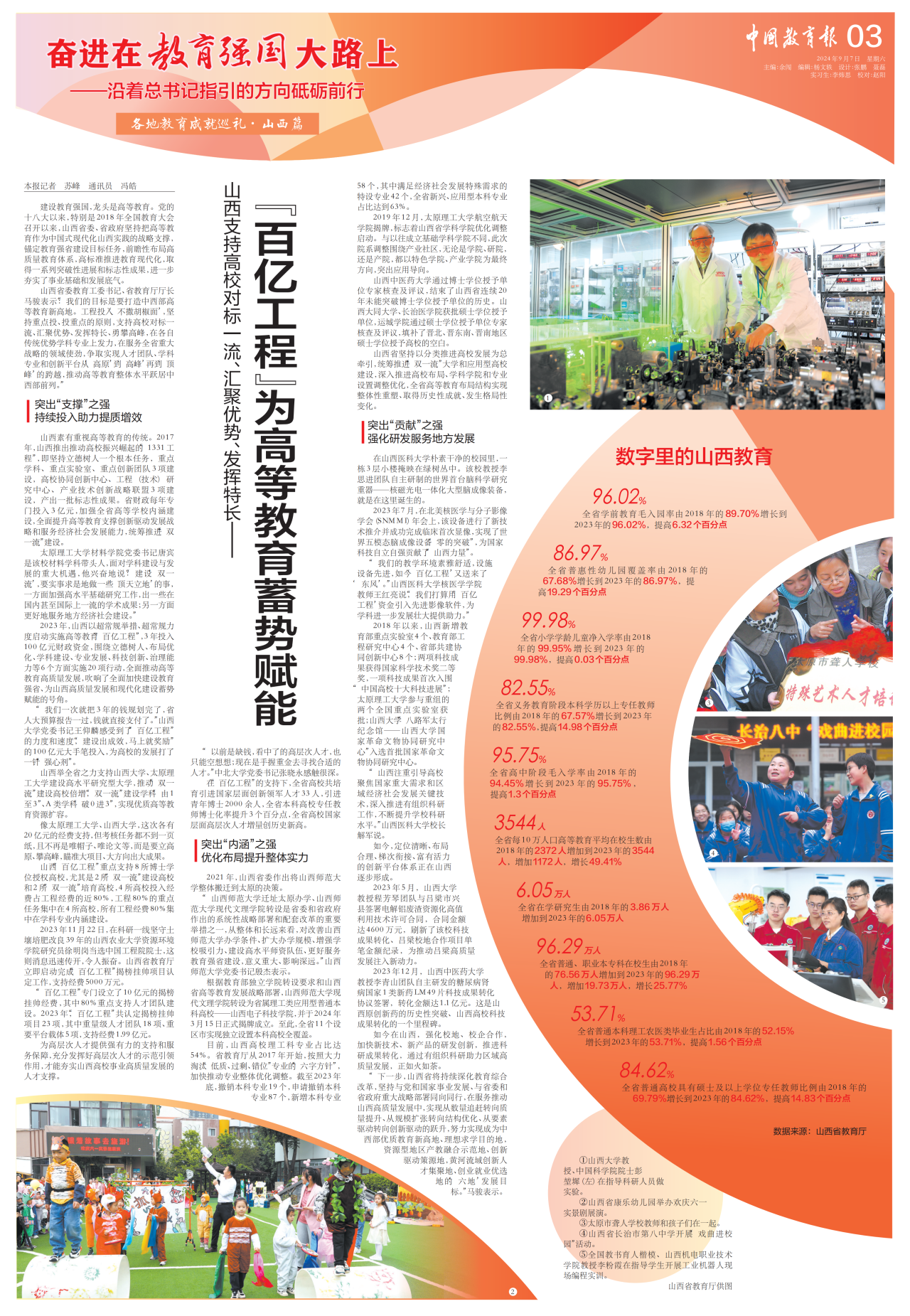 2023年,山西以超常规举措、超常规力度启动实施高等教育“百亿工程”,3年投入100亿元财政资金,围绕立德树人、布局优化、学科建设、专业发展、科技创新、治理能力等6个方面实施20项行动,全面推动高等教育高质量发展,吹响了全面加快建设教育强省、为山西高质量发展和现代化建设蓄势赋能的号角。