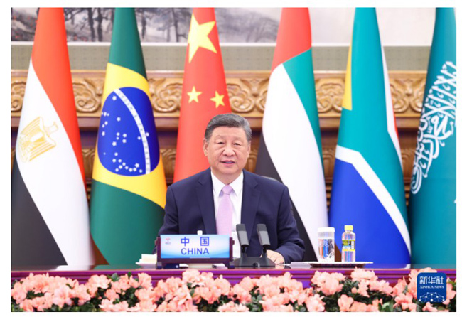 习近平指出,当前,世界百年变局加速演进,霸权主义、单边主义、保护主义甚嚣尘上。金砖国家作为全球南方第一方阵,要坚持弘扬开放包容、合作共赢的金砖精神,共同捍卫多边主义,维护多边贸易体制,推进“大金砖合作”,携手构建人类命运共同体。