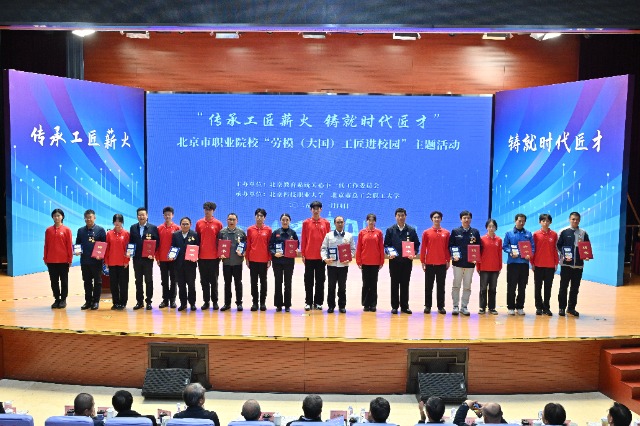 11月4日,北京市职业院校“劳模(大国)工匠进校园”活动中,10名北京科技职业大学的学生为10位劳模工匠颁发“班级工匠导师”聘书。北京科技职业大学供图