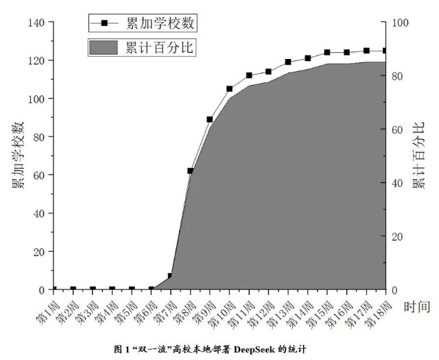 如图1所示,从“双一流”高校本地部署DeepSeek的累加次数与百分比分布,可以清晰观察到DeepSeek在高校中的推广过程呈现出典型的S型扩散曲线特征,部署学校累加数量与百分比均显示出由缓到快、再趋于平稳的演进轨迹,与创新扩散理论(Diffusion of Innovations Theory)中所描述的技术采纳模式高度契合。在图示初期阶段(第1至7周,即2025年1月1日至2月18日),部署DeepSeek的高校数量缓慢增长,主要由以“985”高校为代表的技术创新者(Innovators)引领。这类高校具备雄厚科研基础、较强风险承担能力和对前沿技术的敏锐判断力,是技术扩散的先行试点。进入中段(第8至10周,即2025年2月19日至3月11日)后,随着早期部署高校的经验示范效应增强以及大模型技术自身稳定性提升,越来越多“211”高校和部分其他“双一流”高校开始加入部署行列,构成扩散中的早期多数(Early Majority)群体。此阶段部署高校数量迅速上升,呈现加速扩张态势,是扩散曲线的跃升期。随着部署高校数量逼近饱和,图示后期(第11至18周,即2025年3月12日至5月6日)增长曲线逐渐平缓,进入稳定扩散阶段。剩余未部署高校为晚期多数(Late Majority)或滞后者(Laggards),其部署受限于资源条件与组织能力,往往需要政策激励、区域协同等外部强干预力量推动[2]。