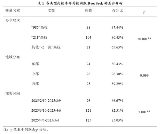 从创新扩散的视角来看,DeepSeek在高校层级与地域层面的推广过程呈现出典型由上而下的扩散路径,部署态势表现出显著的层级化差异。从办学层次来看,DeepSeek部署比例随着高校办学层次递减而逐级降低。如表1所示,截至2025年5月,全国“985”高校中已有38所部署DeepSeek,占比高达97.44%,“211”高校部署率为90.43%,而在非“211”高校但仍属于“双一流”建设高校中,仅有69.63%的高校完成部署,不同办学层次的高校在是否部署DeepSeek上有显著的统计学差异(p<0.001)。这一趋势表明,办学层次较高的高校更易获得人工智能布局的政策与资源支持,部署节奏也更为迅速,展现出较强的先行示范效应。国家重点建设的“985”与“211”高校,通常拥有更充裕的科研经费与更强的技术基础设施,在校内具备较为完善的信息化管理体系,更容易对接并落地通用大模型。相较之下,部分普通“双一流”高校在硬件投入、技术团队建设和跨部门协同方面仍存在短板,使其在部署大模型时面临更多的现实制约。从高校地域来看,部署率在不同区域间的总体差异并不显著,但仍呈现出一定的地域分布规律。地域差异的成因既包括地区经济发展水平、教育信息化建设程度等客观因素,也受到地方政策引导、教育行政管理方式与高校间协作机制的影响。中部地区有较强的区域协同传统与高校联盟体系,使得新技术推广可以通过以点带面的模式快速扩展。相较之下,东部地区的部署节奏反而略显滞后,可能与高校自主性较高有关。从部署时间来看,高校大规模部署DeepSeek的时间集中在二月中旬到四月上旬,呈现出迅速增长到逐渐饱和的规律,“双一流”高校对DeepSeek的部署时间上存在显著的统计学差异(p<0.001)。