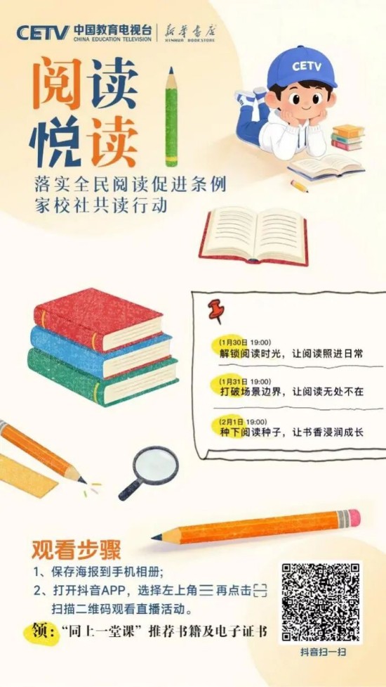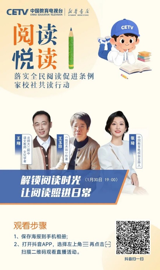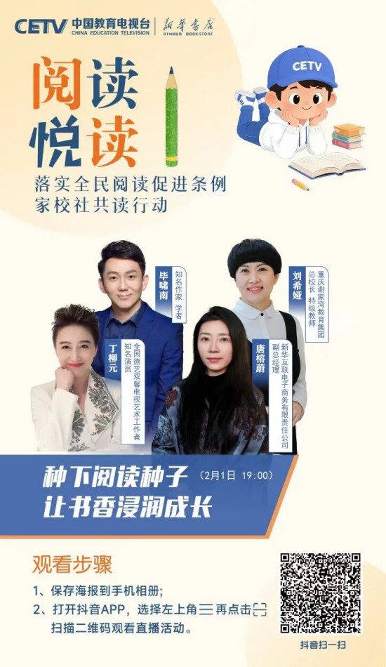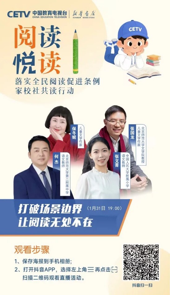 为推动条例有效落地、培养广大青少年更好地阅读,在教育部基础教育司指导下,中国教育电视台联合人民教育出版社、新华书店总店,特邀阅读推广人、阅读领诵人、阅读分享人等,共同开启“落实全民阅读促进条例 家校社共读行动”全媒体直播活动。这不仅是对条例精神的践行,更是对“读书破万卷,下笔如有神”的文化传承,是为青少年搭建与先贤对话、与自我对话、与世界对话的精神桥梁。