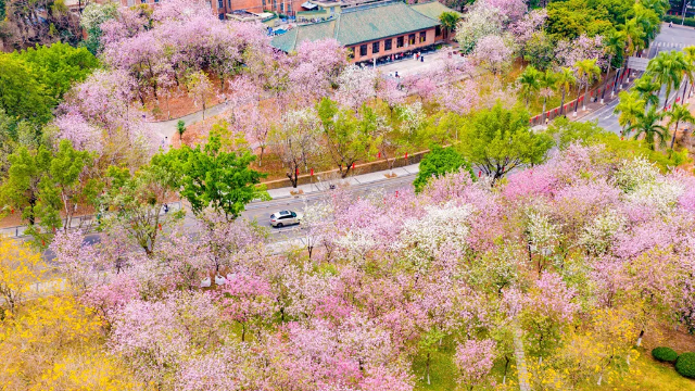 据介绍,华农天河五山校部占地4400余亩,校内植被丰富,尤其是春季生态景观得天独厚。每年3月花开,5000余株宫粉羊蹄甲连绵成海,清风拂过粉瓣翩跹;2000余株樱花、数百株黄花风铃木及木棉等竞相开放,勾勒羊城春日盛景。
