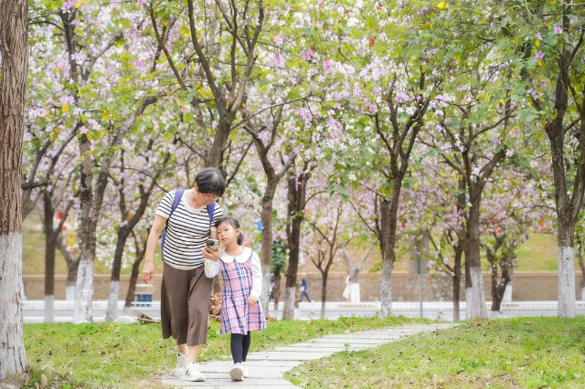 家长带着孩子畅游华南农业大学紫荆花林。华南农业大学宫粉羊蹄甲花海中,亲子携手穿行同赏烂漫春景。胡欣玲 摄