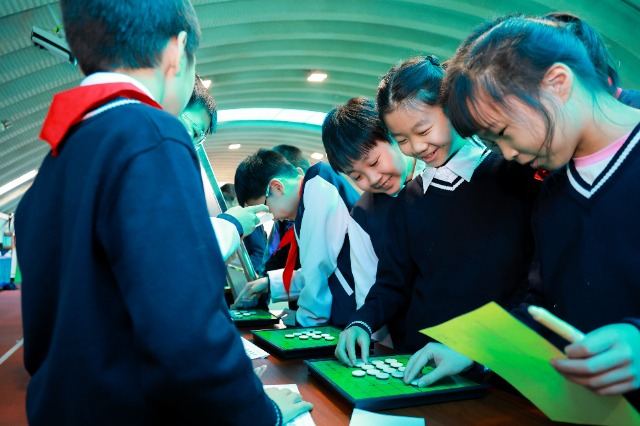 3月16日,北京市灯市口小学“玩转数学智趣同行”第二届“π”节开幕,学生们在活动中体验数学乐趣。朱博 摄