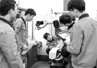 宜宾职业技术学院数控专业学生在调试工业机器人协助数控机床自动上下料。