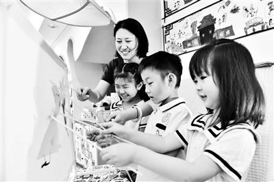 教师和幼儿用皮影讲故事。 幼儿园供图