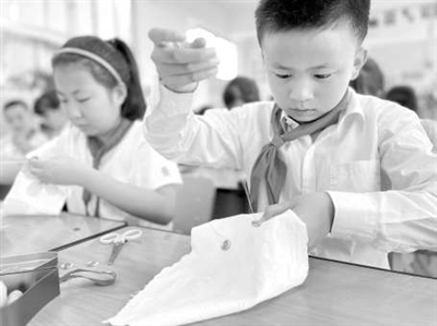 学生参加学校劳动技能大赛之钉纽扣。 烟台市芝罘区鲁峰小学供图