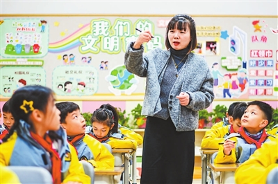 12月3日,杭州市长寿桥岳帅小学教师在课堂上教导学生们如何使用智能笔答题。