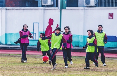 12月16日,浙江省湖州市织里镇轧村中学的学生们在阳光大课间活动中参加足球游戏。近年来,该校着力打造特色阳光大课间活动,适配不同体能、兴趣学生的需求,提高了学生身心健康水平。