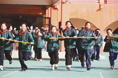 1月15日,江苏省徐州市鼓楼小学学生在大课间参加推杆跑活动。该校根据季节特点,开展跳绳、推杆跑等适合学生冬季运动的大课间活动,引导学生走出教室进行体育锻炼,享受运动带来的快乐。蒯创 摄