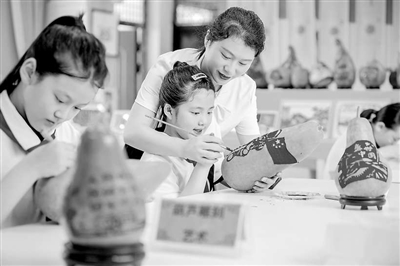 ①豫章师范学院附属安义板溪小学教师指导学生进行葫芦雕刻。