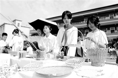 ②江西省莲花县花塘小学学生在校园集市上展示竹编作品。