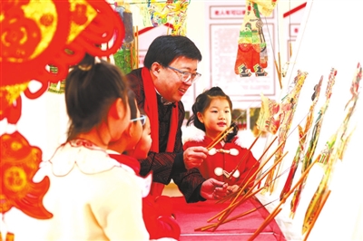 1月29日,在河北省唐山市丰润区太平路街道锦祥社区,皮影非遗传承人指导小朋友表演皮影戏。朱大勇 摄