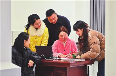 全国政协委员、湖南省岳阳市岳阳楼区东风湖学校教师柳玲玲(右二),就自己将在今年两会上提交的提案,向同事们征询意见。