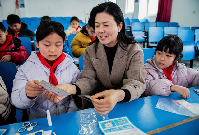 3月23日是第66个世界气象日,近日各地中小学纷纷开展气象科普主题活动,让气象知识走出课本、来到孩子们的身边。孩子们在生动有趣的互动体验中观察气象、探索自然,感受科学魅力。图为3月19日,在安徽省含山县清溪镇巨兴中心学校,当地气象局工作人员指导学生做气象小作品。欧宗涛 刘周华 摄