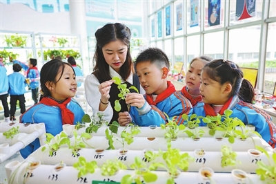 在湖北省襄阳市大庆路小学“校园农场”,教师在给学生讲解水培植物的相关知识。 资料图片