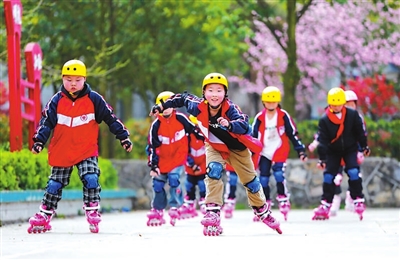 贵州省黔西市钟山镇钟山小学轮滑社团的学生在校园内练习轮滑。 资料图片