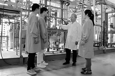 福州大学与紫金矿业集团共同引进的蒋开喜教授(右二)和学生讨论加压浸出技术问题。