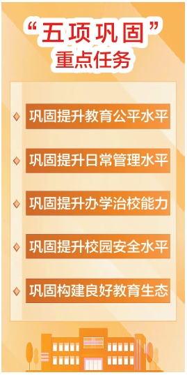 结合基础教育规范管理发展新形势新问题新要求,通知有针对性地提出“五项巩固”重点任务。一是巩固提升教育公平水平,通过规范招生行为、规范学籍管理、“隐性失学”问题治理,促进公平水平的持续提升。二是巩固提升日常管理水平,通过“哨点学校”监测、优化课间活动、加强心理健康服务管理、规范作业管理和考试,促进“健康第一”理念扎实落到学生成长全过程。三是巩固提升办学治校能力,通过领导干部能力提升计划、组织县长局长专题培训、基地校跟岗研修、学校声誉评价等,推动把规范管理要求落到每所学校。四是巩固提升校园安全水平,通过完善联动机制、强化安全隐患排查、防范校园欺凌、深化“三项整治”等,促进校园安全保障落细落实。五是巩固构建良好教育生态,通过规范社会事务进校园、师德师风建设、强化家校社协同,优化学生健康成长、教师潜心育人、社会尊师重教的教育环境。